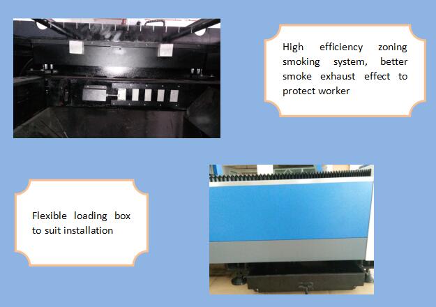 3. High efficiency zoning smoking system at both sides of machine body, Strong segmented dust and smoking collection, it will reduce harm to worker.