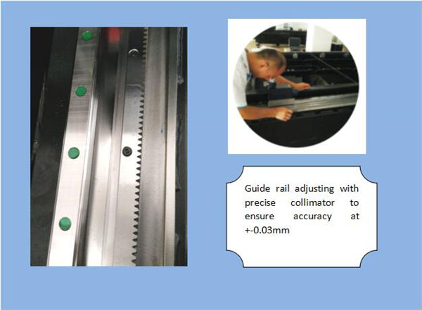 | Name:Precision Linear Guides Advanced cutting system, laser power and servo movement suit each other perfectly, imported high precision gear and rack drive system, exchangeable double work table, to ensure higher processing speed and accuracy.. |